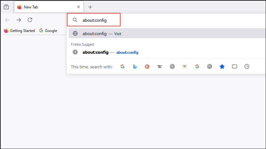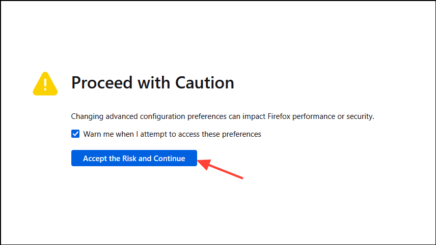 - 打開 Firefox,然後在地址欄中輸入 about:config,按下 Enter 鍵。