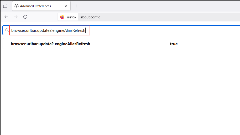 - 在頂部的搜索欄中輸入 browser.urlbar.update2.engineAliasRefresh,應該會看到該值設置為「True」。如果不是,請點擊右側的切換按鈕將其設置為 true。