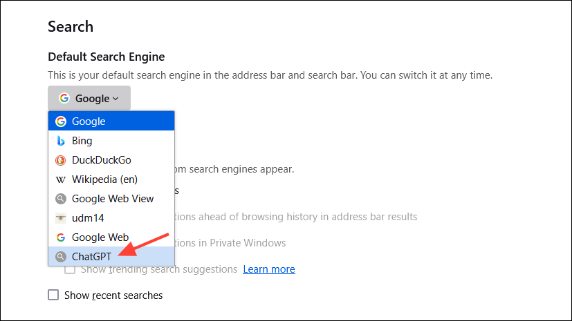 - 接下來向上滾動,點擊「默認搜索引擎」下拉菜單,選擇 ChatGPT。