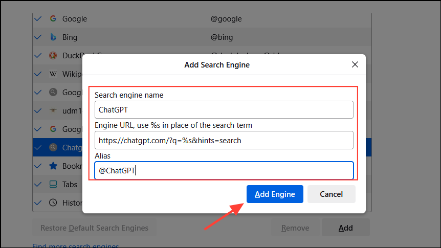 - 在名稱欄中輸入你想添加的搜索引擎名稱,例如 ChatGPT,並在 URL 欄中粘貼以下內容:https://chatgpt.com/?q=%s&hints=search。然後在「別名」欄中輸入 @ChatGPT,並點擊「添加引擎」按鈕。