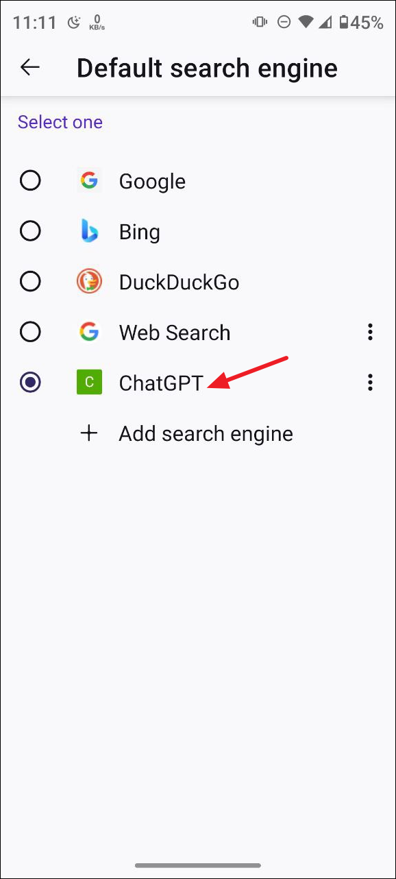 - 現在,在「默認搜索引擎」頁面上點擊 ChatGPT 將其設置為默認搜索引擎。