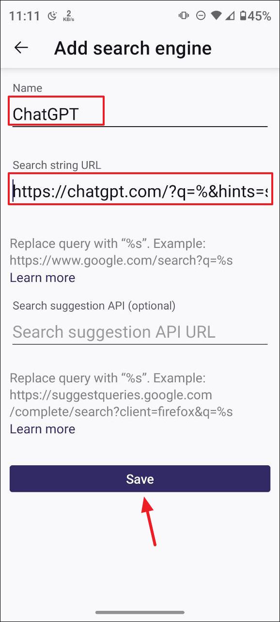 - 在名稱欄中輸入 ChatGPT,然後在 URL 欄中輸入 https://chatgpt.com/?q=%s&hints=search,然後點擊「保存」按鈕。