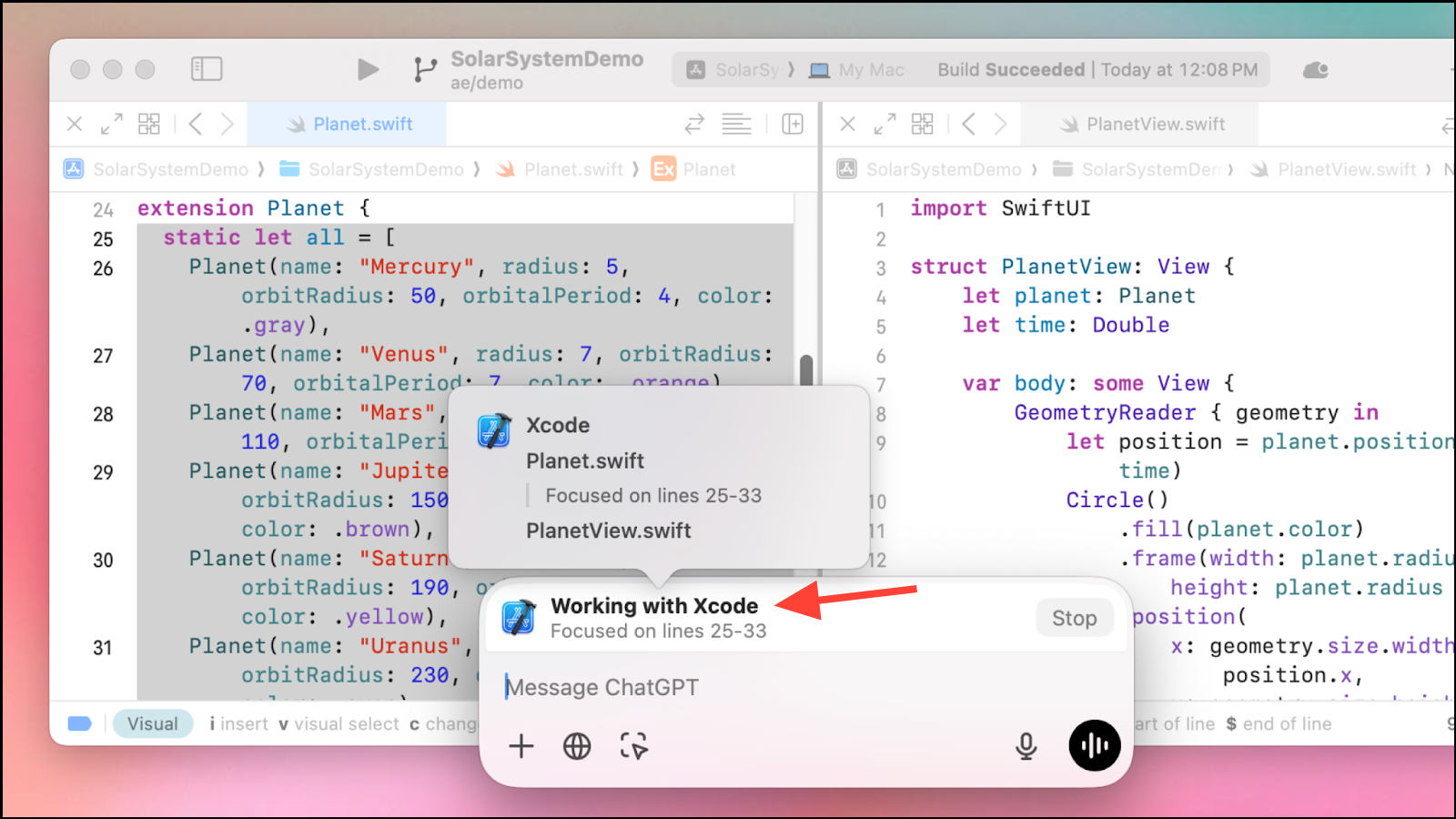 一旦選擇了應用程式,該應用程式的上下文以及用戶的文本提示會一同發送給 ChatGPT。用戶也可以在應用程式中選擇任何內容,ChatGPT 將專注於選擇的文本或代碼;完整的上下文仍會發送給 ChatGPT。用戶可以從提示欄中查看發送給 ChatGPT 的內容。