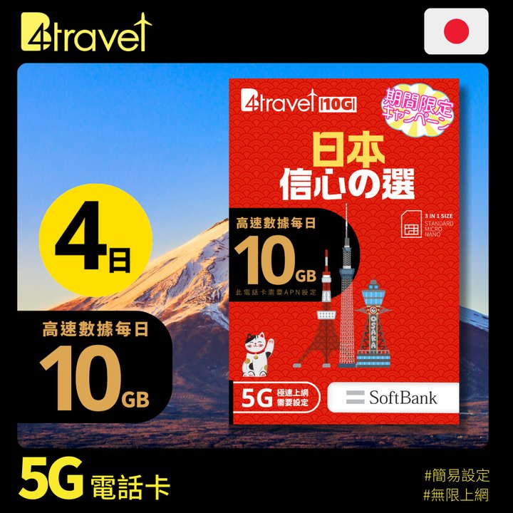 B4travel 10G 日本 4日 40GB 5G 無限上網卡 (期間限定)(每日 10GB)
