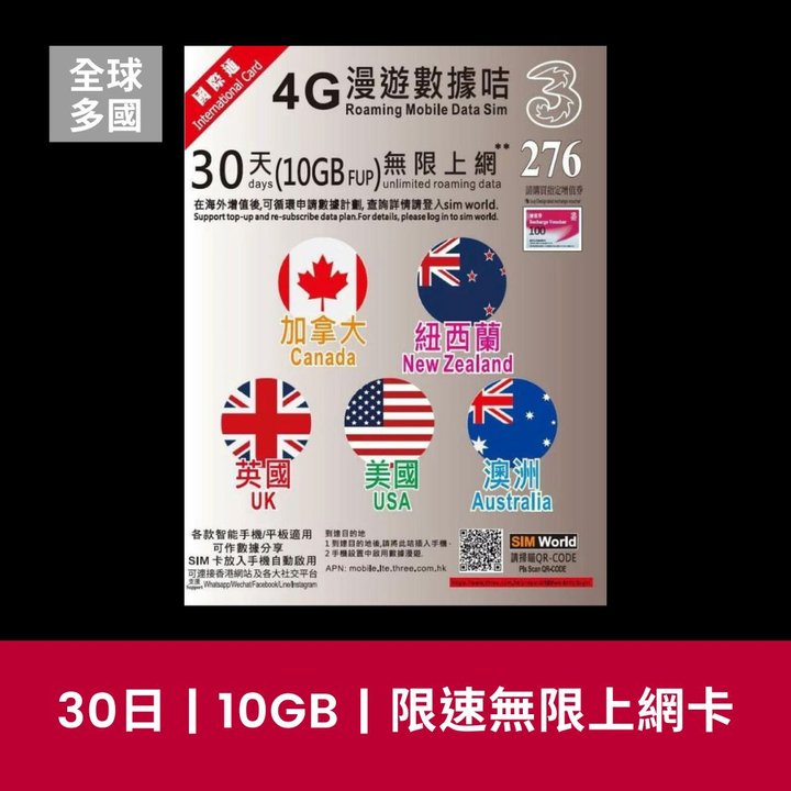 3 國際萬能卡 英國、美國、加拿大、澳洲、新西蘭 30天 10GB 限速無限上網電話卡