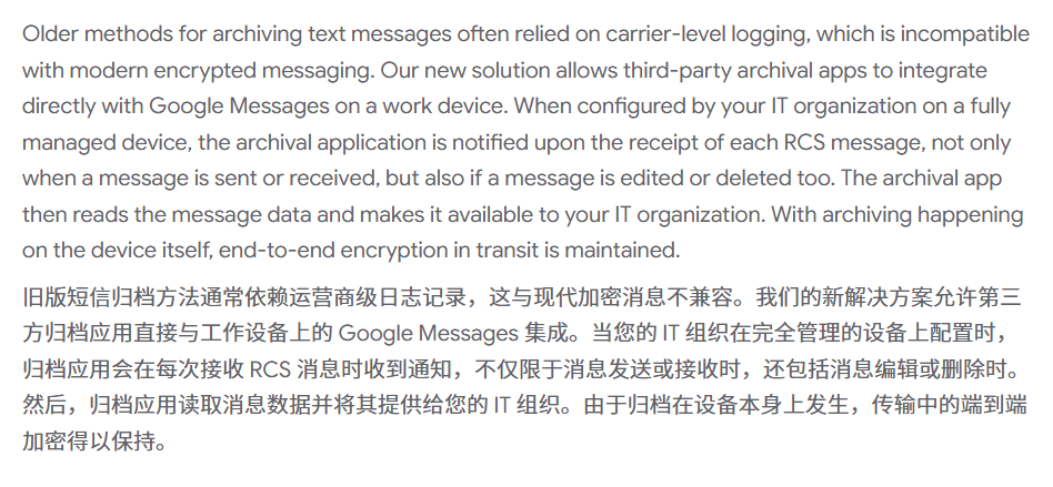 儘管 RCS 消息在傳輸過程中享有端到端加密的保護,但一旦消息存儲在由公司控制的設備上,這些消息將被解密,從而可被雇主訪問和閱讀。Google 表示,這是一個可靠且支持 Android 的消息存檔解決方案,旨在幫助組織滿足其監管要求。當存檔功能啟用時,員工的設備上會顯示明確的通知,以確保透明度。