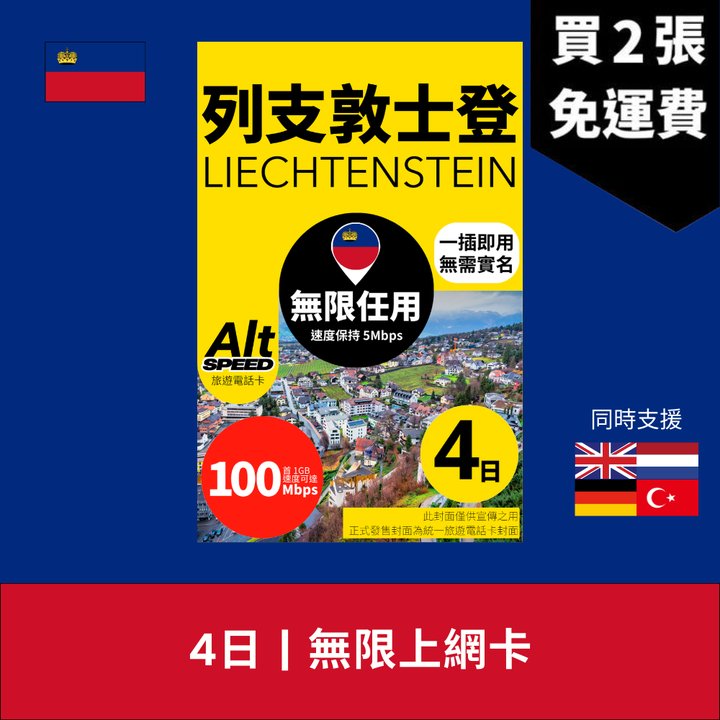 Alt Speed 列支敦士登 4-7天 無限上網電話卡 以無限數據同即插即用為賣點,適合需要穩定網絡的短期旅客。呢款產品不設語音通話及短訊,專注於數據使用,令用戶在旅行期間可以隨時保持聯繫。