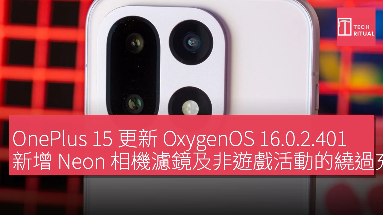 OnePlus 最近為 OnePlus 15 發佈了 OxygenOS 16.0.2.401 更新。此版本包含了 2025 年 12 月的 Android 安全補丁,並在默認相機應用中新增了「Neon」濾鏡,模擬 CineStill 800T 胶卷效果。