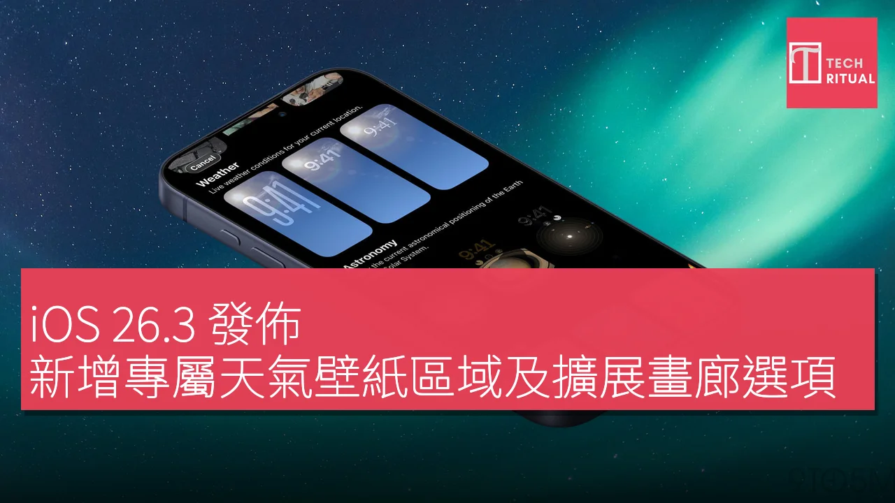 iOS 26.3 beta 1 昨日為開發者發佈,帶來了一些預期的變化,同時也有一個小驚喜:牆紙庫增設了專門的天氣區域。這次更新將天氣與天文的牆紙分成了兩個獨立的部分,並新增了選項。