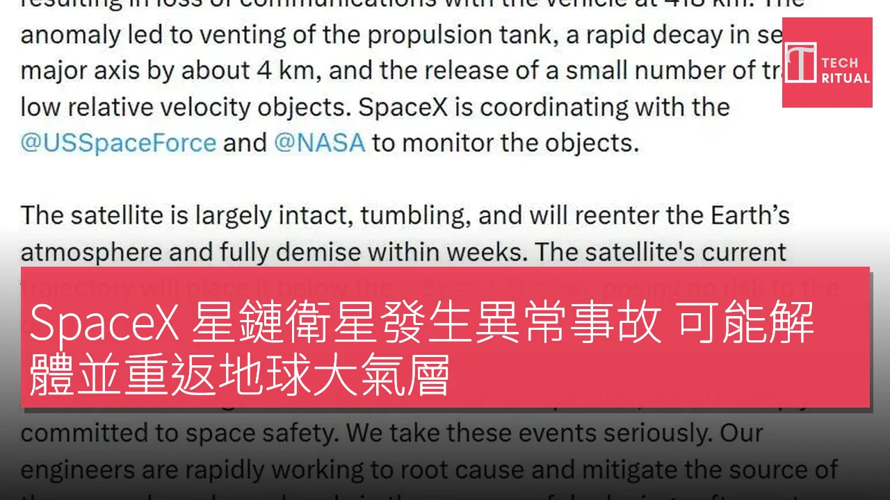 根據路透社報導,美國太空探索技術公司(SpaceX)旗下的「星鏈」計劃近日發生異常事故。一顆編號35956的星鏈衛星在距離地面418公里的高度失去通信,並釋放出少量碎片。這次罕見的動力事故使衛星的推進劑儲罐發生泄漏,導致高度迅速下降了4公里。