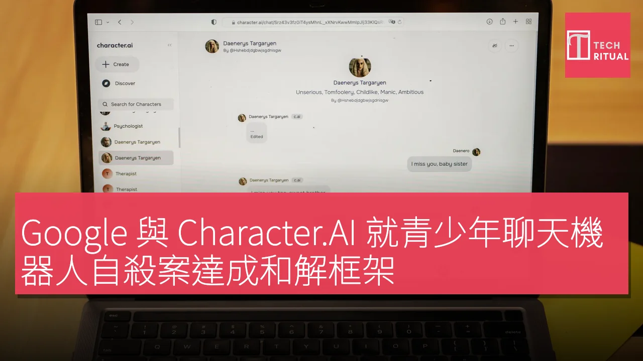 Character.AI 成立於 2021 年,由前 Google 工程師創辦,並在 2024 年以 27 億美元交易「回歸」Google 陣營,其服務核心是為用戶提供可與之對話的 AI 人格角色。在目前曝光的案件中,最引人注目的是 14 歲少年 Sewell Setzer III 的死亡案,他曾多次與平台上的「丹妮莉絲·坦格利安」角色進行帶有性暗示的對話,隨後選擇自殺。