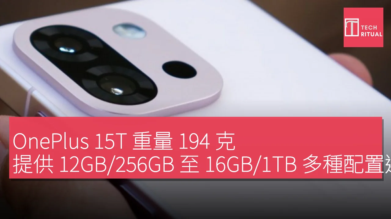 OnePlus 15T 重量 194 克,提供 12GB/256GB 至 16GB/1TB 多種配置選擇