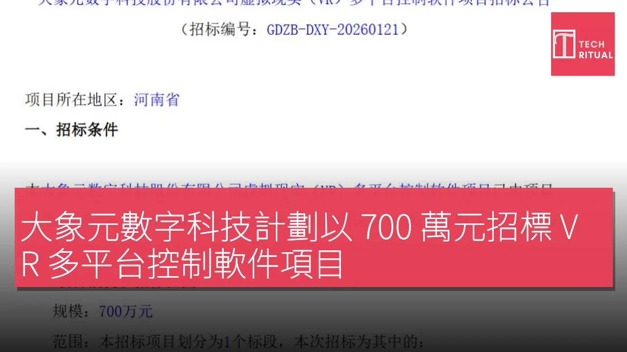 大象元數字科技公告,計劃以 700 萬元人民幣招標 VR 多平台控制軟件,該項目已獲得相關機關的批准,資金來源為自籌。