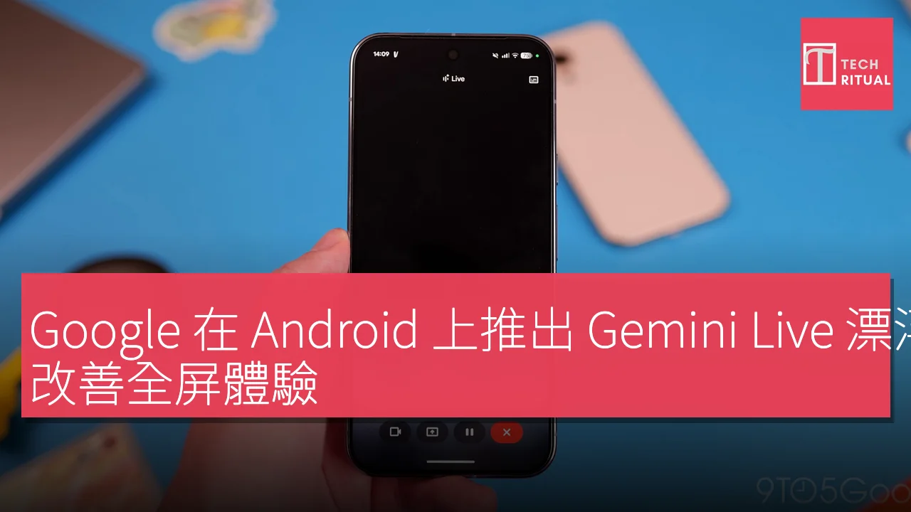 該圓形的背景是 Gemini Live 的波形,而文本轉錄則顯示在上方。用戶可以從右上角開關這些功能。如果在手機上進行其他操作,圓形會縮小為一個可以移動的圓點。用戶可以點擊以展開,或向下滑動以關閉(如同聊天頭)。這次改設計保留了全螢幕界面(只需再次打開 Gemini 應用),而視頻分享則使用完整的 UI。