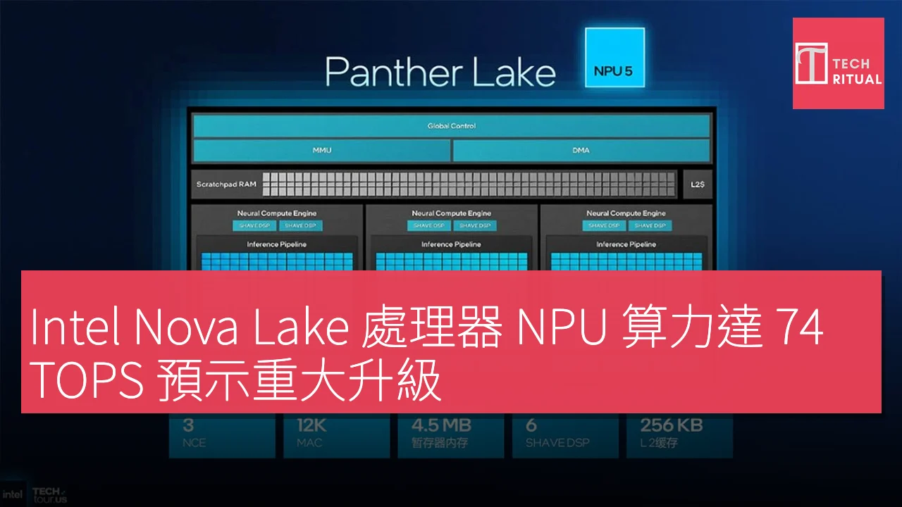 隨著Intel推出的 Lunar Lake 處理器,第四代 NPU 算力達到了 50 TOPS,滿足了該需求。而在最新的酷睿 Ultra 300 系列 Panther Lake 上,第五代 NPU 在維持相同算力的情況下,縮小了芯片面積,同時新增了對 FP8 量化運算的支持。