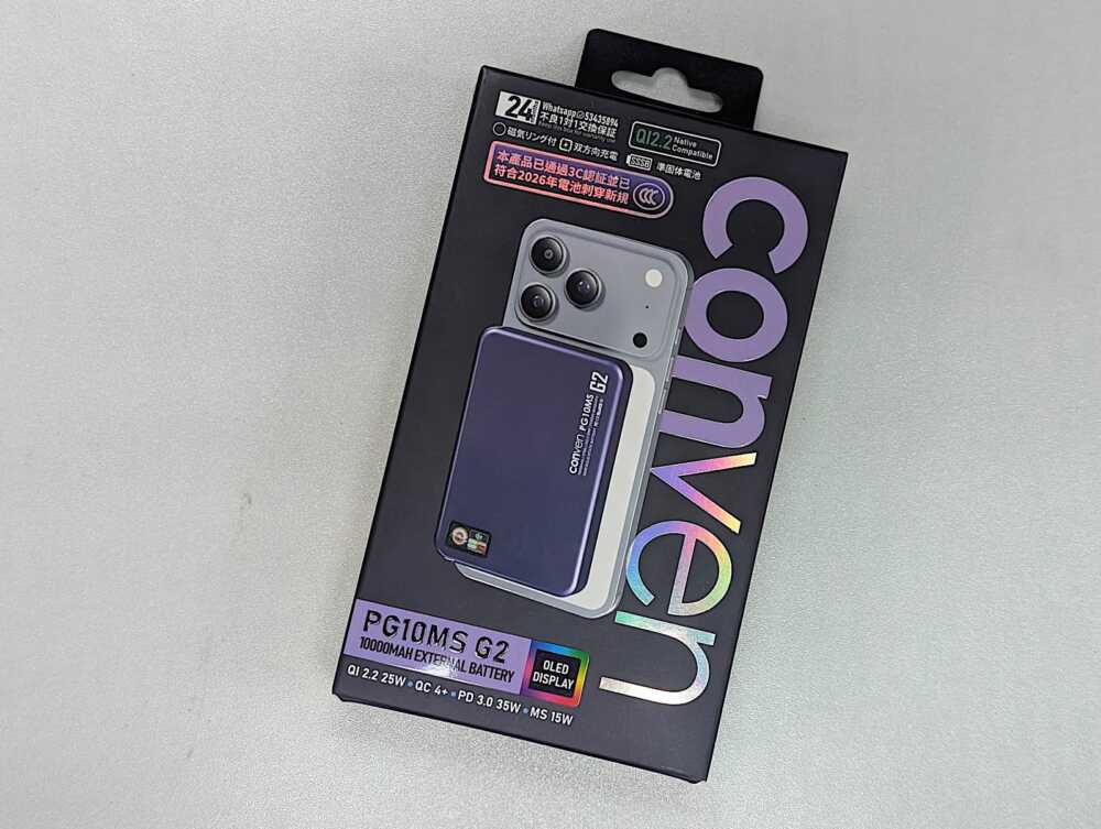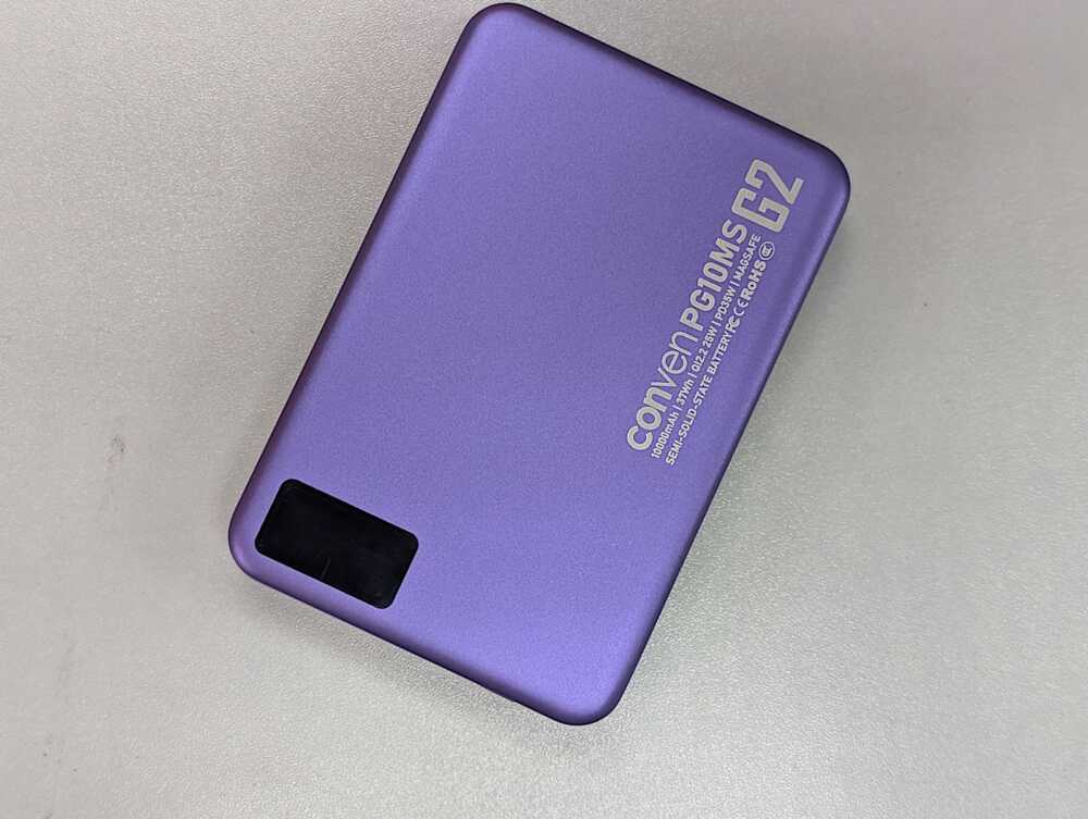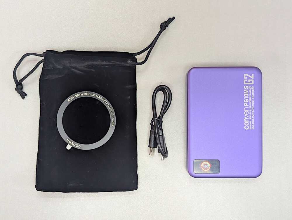 CONVEN PG10MS-G2 的包裝簡約而不失質感,內附產品、攜帶袋、磁吸環和 USB-C 充電線,方便使用。產品外殼採用優質材質,表面有細微的磨砂質感,手感舒適且不易沾指紋。其設計語言偏向現代簡約,提供黑色和紫色兩種顏色選擇,能夠搭配不同風格的電子產品。