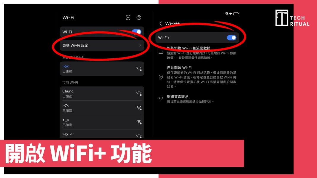 honor Magic V6 除了一般的 WiFi 功能外,記得要選擇更多 WiFi 設定,然後選擇開啟上方的 WiFi+,這樣就可以智能切換 WiFi 和流動數據,也可以自動開啟 WiFi 等等。這個功能簡單,但也是需要打開的。