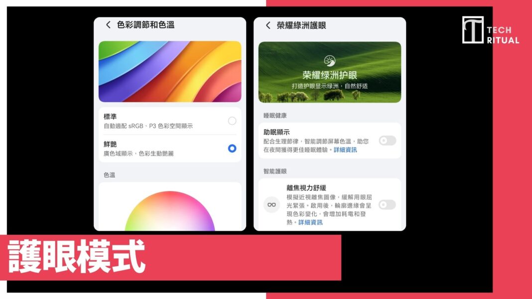 honor Magic V6 內選擇顯示和亮度,然後僅記打開超動態顯示,這樣在播放影片時,可以有更高的亮度,明暗對比都會更加真實。另外,更重要的是打開設定裡的榮耀綠洲護眼,打開「自然色彩顯示」及「離焦視力舒緩」及「助眠顯示」,這些都可以讓屏幕效果更好。
