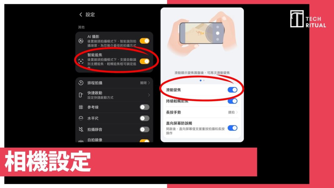 其次,「AI 鍵相機內操作」展示了其獨特的操控手勢,讓單手拍攝變得更像在使用專業相機。透過「滑動變焦」功能,用家只需在快門鍵上滑動即可喚出變焦圓盤進行縮放,操作手感流暢且直觀,無需雙指縮放螢幕。此外,系統還貼心地設計了「直向屏幕防誤觸」功能,開啟後能防止手指在握持手機時意外觸發快門,只有明確的重按或長按手勢才會被識別,大大提升了拍攝時的穩定性與準確度。