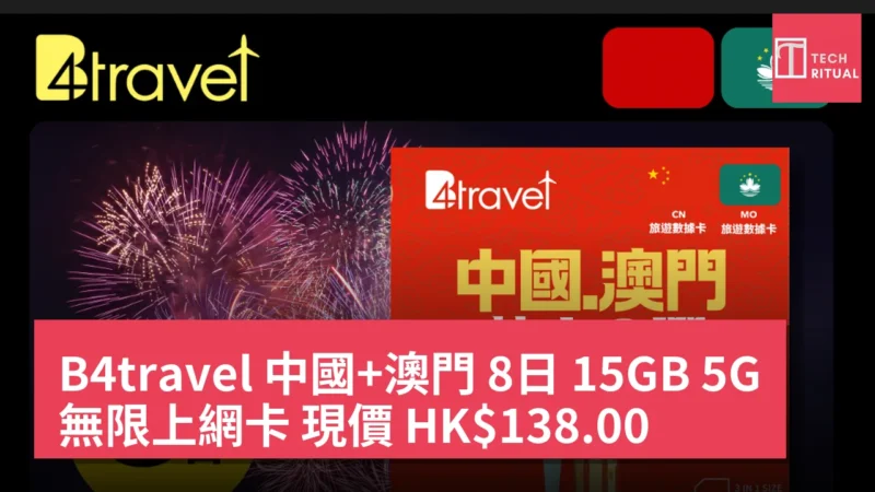 B4travel 中國+澳門 8日 15GB 5G 無限上網卡 現價 HK$138.00
