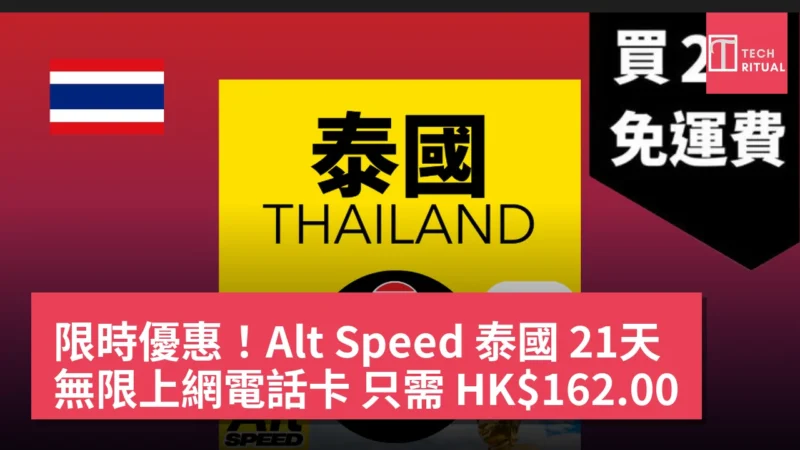 Alt Speed 泰國 21天 無限上網電話卡現售 HK$162(原價 HK$224,減 HK$62),減幅達 27.7%。呢款卡提供無限數據,保持速度於 5Mbps,並且首 1GB 數據速度可高達 100Mbps,適合需要長時間上網嘅旅客。