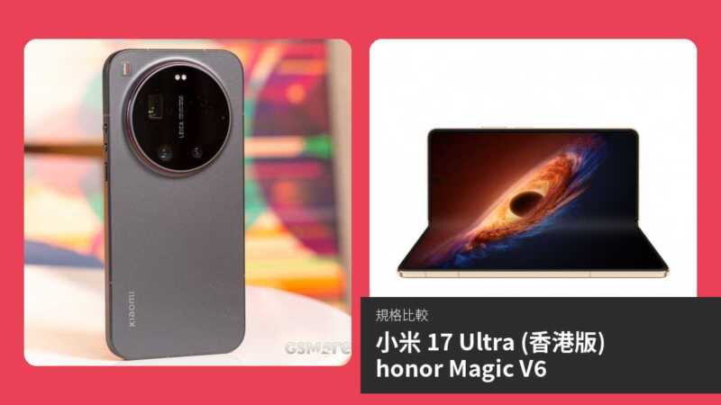 綜合比較,小米 17 Ultra (香港版) 在攝影、散熱與 AI 功能大幅領先,適合攝影愛好者與效能追求者,其直板設計更實用日常。honor Magic V6 憑折疊雙屏、更亮顯示、更大電池與 IP69 防水勝出,理想多工與戶外用戶,但相機與軟件成熟度稍遜,且需待 2026 年發佈。