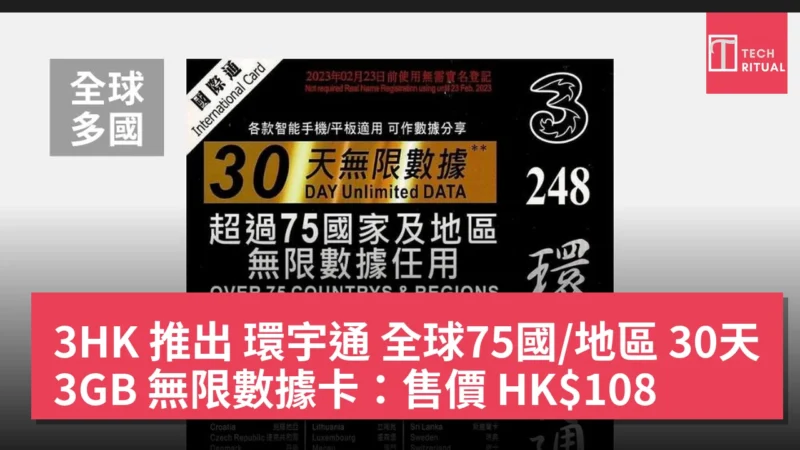 3 國際萬能卡 「環宇通」全球75國/地區 30天 最大 3GB 無限數據卡