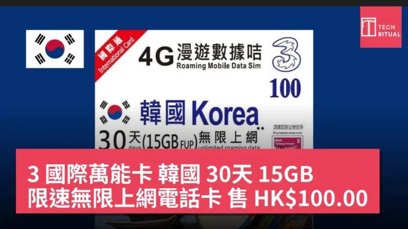3 國際萬能卡 韓國 30天 15GB 限速無限上網電話卡 售 HK$100.00