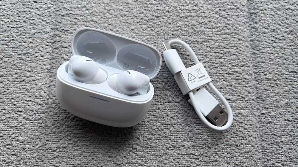 REDMI Buds 8 Pro的包裝設計簡約而不失精緻,採用了覆膜工藝,使得包裝盒呈現出一定的反射效果。配件方面,包裝內含有三對不同尺寸的耳塞套(小、中、大),以及一條Type-C充電線。這次小米並未附贈收納包,對於需要便攜存放的用戶來說可能稍有不便。