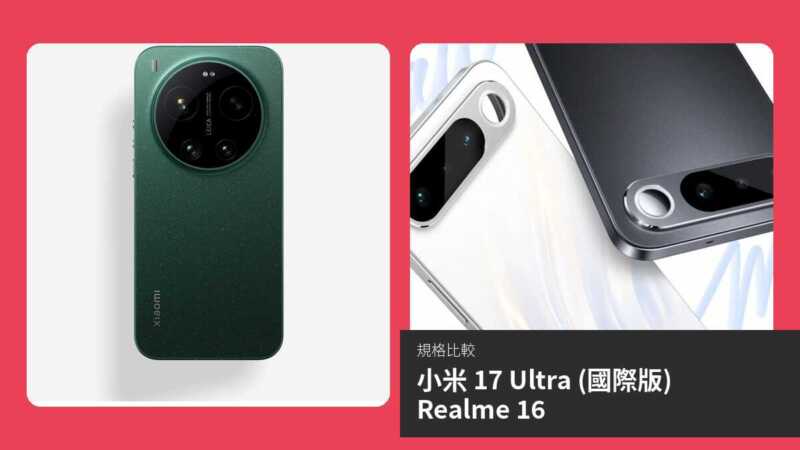 小米 17 Ultra (國際版) 與 Realme 16 均為即將發佈的旗艦級 5G 智能手機,前者預計於 2026 年 3 月推出,後者則於 2026 年 2 月上市。兩者均搭載 Android 16,並具備 IP68/IP69 防水防塵等級,但定位截然不同:小米 17 Ultra 強調頂級影像與效能,Realme 16 則注重電池續航與性價比。本文將透過規格對比與詳細分析,幫助讀者了解兩款手機的優劣,助你選擇最適合的機型。
