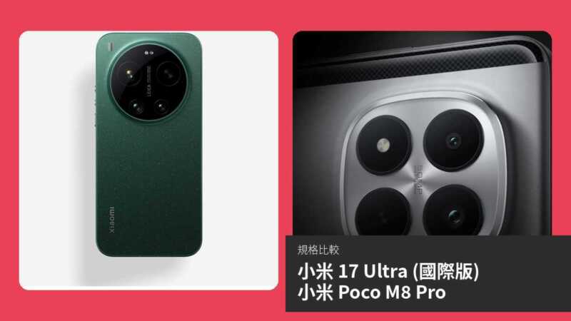 小米 17 Ultra (國際版) 與小米 Poco M8 Pro 是小米旗下兩款定位不同的 5G 智能手機,前者為 2026 年 2 月底公布的旗艦級產品,預計 3 月發佈;後者則於 2026 年 1 月已正式推出。兩機均支援 IP68/IP69 級防水防塵,但小米 17 Ultra 在相機系統、處理器及顯示技術上更為先進,而 Poco M8 Pro 則以更大電池及更快有線充電見長。本文將透過規格對比及詳細分析,幫助讀者了解兩者的差異,找出適合不同需求的選擇。
