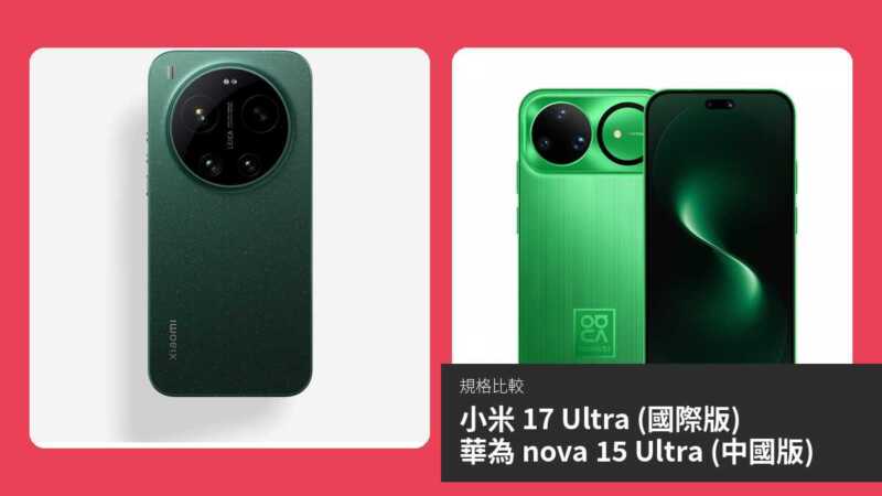 小米 17 Ultra (國際版) 與華為 nova 15 Ultra (中國版) 分別代表了兩大中國手機巨頭在 2026 年初的旗艦級產品。小米 17 Ultra 預計於 2026 年 3 月發佈,搭載最新 Snapdragon 8 Elite Gen 5 處理器,而華為 nova 15 Ultra 已於 2025 年 12 月上市,採用 HarmonyOS 6.0 及麒麟 9010S 晶片。本文將透過規格對比及詳細分析,幫助讀者了解兩者在屏幕、效能、攝影及連接性等方面的差異,找出適合不同需求的優勝者。