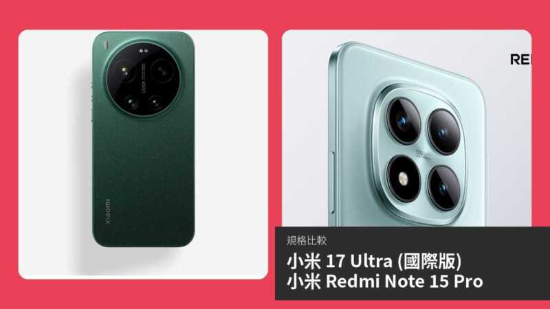 小米 17 Ultra (國際版) 與小米 Redmi Note 15 Pro 兩款手機即將登場,前者預計 2026 年 3 月發佈,後者則於 2025 年 12 月推出。這兩款來自小米的產品,一為旗艦級 Ultra 機種,一為中階 Pro 系列,我們將從規格出發,全面比較它們在屏幕、效能、攝影、連接性等方面的表現,幫助讀者了解哪款更適合日常使用或專業需求。無論你是追求頂級規格還是注重性價比,這篇比較將提供客觀數據分析。