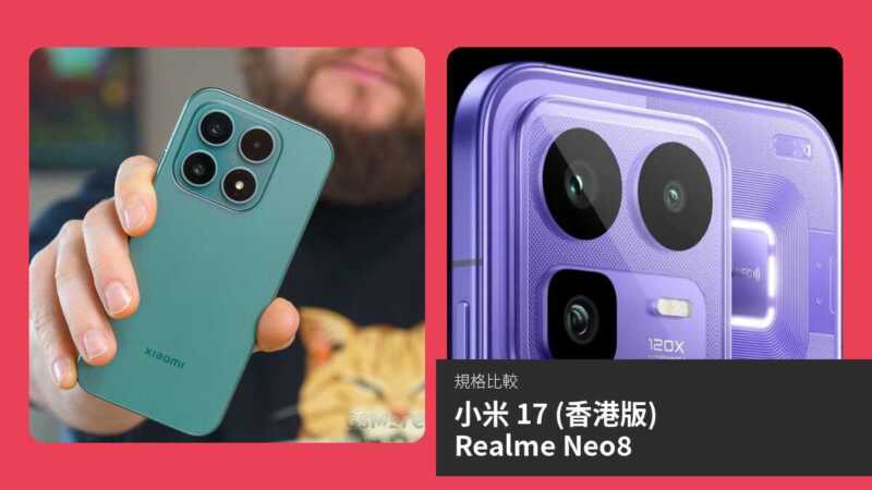 Realme Neo8 在電池續航及儲存選項勝出,小米 17 則在充電速度、防水、輕薄設計及影音規格領先。