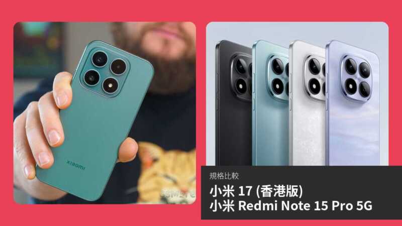 小米 17 (香港版) 作為小米最新的旗艦手機,搭載 Snapdragon 8 Elite Gen 5 處理器及 Leica 聯名相機系統,帶來頂級效能與影像體驗。小米 Redmi Note 15 Pro 5G 則是中階機皇,以大螢幕、超高像素主鏡頭及強大防水等級見長。本文將客觀比較兩款手機的規格與表現,幫助香港用家選擇適合日常、通勤或專業攝影的型號。透過規格對比及詳細分析,我們將評估哪款更值得入手。