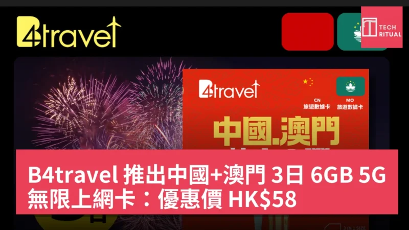 B4travel 中國+澳門 3日 6GB 5G 無限上網卡以 HK$58 為賣點,原價 HK$88,現時享有 HK$30 的折扣,適合需要短期無限上網服務的用戶。使用時只需輸入博客專屬優惠碼「KERBB」可享有額外 5% 折扣,確保你喺旅行中隨時隨地保持連接。