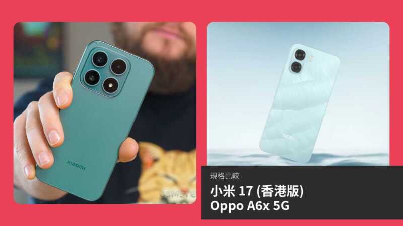 綜合比較,小米 17 (香港版) 在屏幕質素、處理效能、攝影系統、連接性 (Wi-Fi 7、NFC、防水) 及充電速度全面領先,適合追求旗艦體驗、攝影及遊戲用戶。Oppo A6x 5G 雖電池容量略大、有 3.5mm 耳機孔,價格親民,適合預算有限、基本通訊及有線音頻需求的入門用戶。整體而言,小米 17 規格壓倒性優勢,是高端選擇;Oppo 適合輕度使用者。