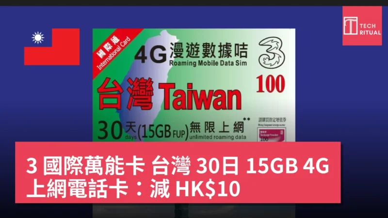 3 國際萬能卡 台灣 30日 15GB 4G 上網電話卡現售 HK$90(原價 HK$100,減 HK$10)。此卡提供 15GB 數據流量,並支援無限上網,讓用戶在台灣旅遊時隨時保持聯繫。使用中華電信網絡,信號覆蓋範圍廣,適合中長期逗留的旅客。