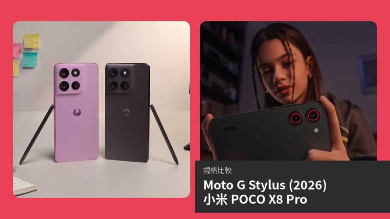 綜合比較,小米 POCO X8 Pro 在效能 (Dimensity 8500-Ultra + 12 GB RAM + UFS 4.1)、電池 (6500 mAh + 100W)、屏幕顯示 (1.5K + 多認證)、錄影功能上全面領先,適合遊戲玩家、重度用戶或追求極速體驗者。Moto G Stylus (2026) 則在自拍 (3,200 萬像素)、觸控筆、3.5mm 孔、無線充、輕薄設計及純 Android 更新上佔優,適合注重生產力、音樂或戶外耐用性的用戶。