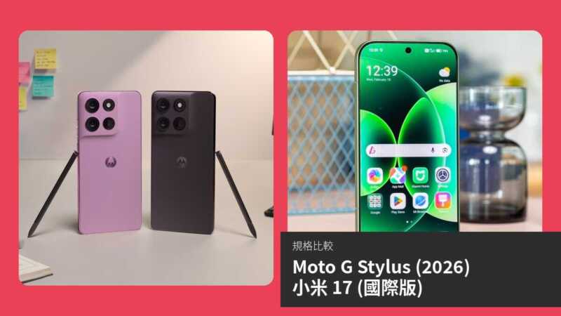 Moto G Stylus (2026) 作為摩托羅拉即將於 2026 年 4 月 16 日發佈的中階機款,帶來內建 Stylus 觸控筆、超高亮度 AMOLED 屏幕及 IP68/IP69 防水等賣點。小米 17 (國際版) 則於 2025 年 9 月 27 日推出,為旗艦級緊湊型手機,搭載頂級 Snapdragon 8 Elite Gen 5 處理器及 Leica 調校三鏡頭系統。本文將透過規格對比及詳細分析,幫助讀者了解兩款手機的優劣,找出最適合日常使用或專業需求的選擇。