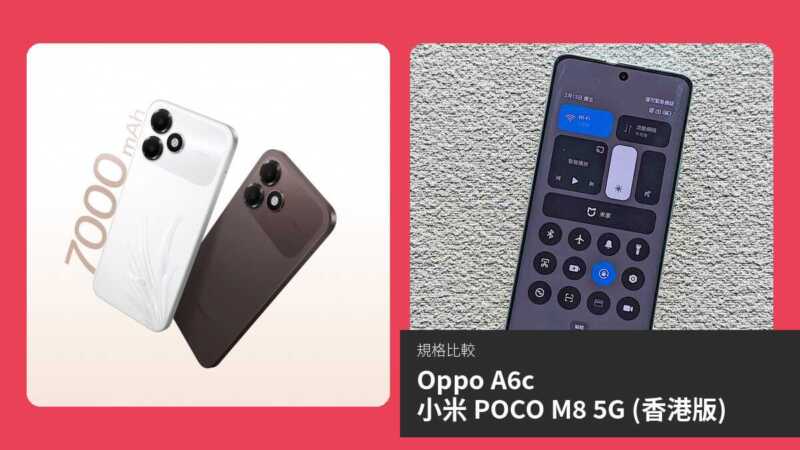 OPPO A6c 則以 7,000 mAh 巨無霸電池及 3.5mm 耳機孔取勝,機身稍大但附贈充電器,價格可能更親民,適合注重超長續航、基本使用及有線耳機的長者或預算用家。整體而言,小米 POCO M8 5G 更強,性價比高;若電池優先,OPPO A6c 值得考慮。(約 2,000 字)