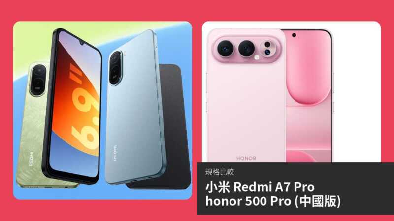 小米 Redmi A7 Pro 雖較新,卻定位入門,優勢僅在大屏幕、6000 mAh 電池及 3.5mm 耳機孔,適合預算有限、注重續航及基本使用的學生或長者。整體而言,honor 500 Pro 更強大,若無中國版限制,值得優先考慮;Redmi A7 Pro 則為實惠替代。