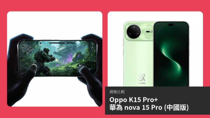 綜合比較,Oppo K15 Pro+ 在效能 (先進 3 nm 晶片、12GB RAM、風扇散熱)、電池 (8000 mAh)、屏幕高刷與防水 (IP69) 全面領先,適合遊戲玩家與長續航需求用戶。華為 nova 15 Pro 則在屏幕像素密度、攝影 (四鏡頭、長焦、高像素自拍)、連接 (Wi-Fi be、藍牙 6.0) 與輕薄機身勝出,HarmonyOS 生態適合華為用戶。