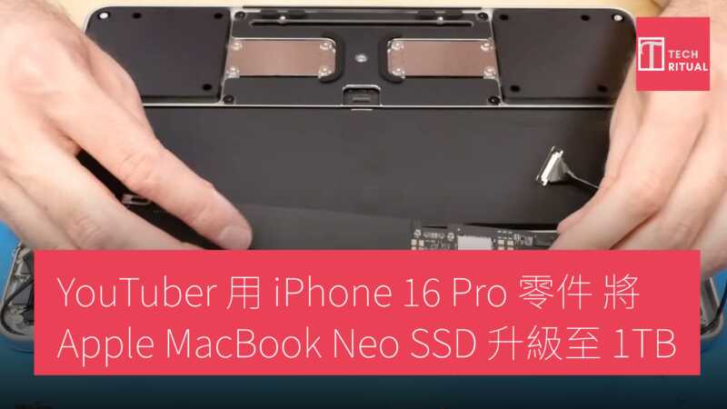 YouTuber Dosdude1 成功對 Apple MacBook Neo 進行 DIY 儲存升級,將原裝 256GB SSD 換成 1TB 版本,此為 Apple 未提供的配置。MacBook Neo 與 iPhone 16 共用相同 A18 Pro 處理器,因此可借用 iPhone 16 Pro 頂配的 1TB NAND 晶片(型號 K8A5),升級後運作順暢無誤。