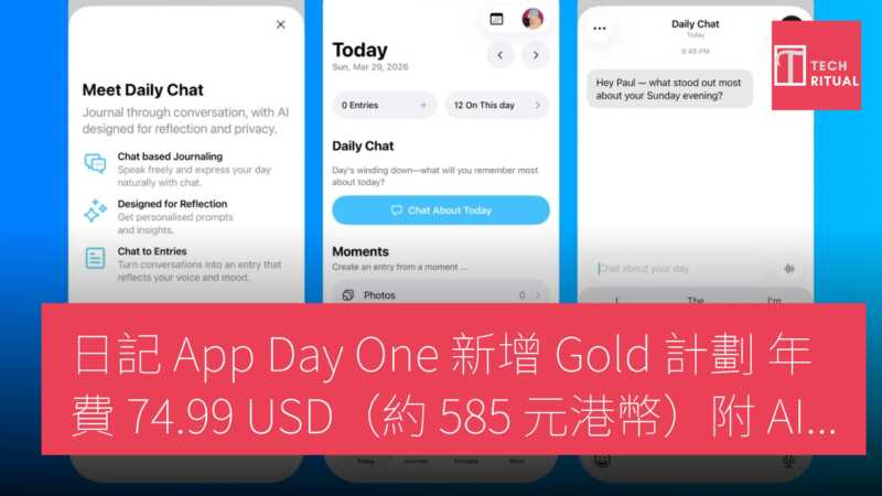 日記應用 Day One 重新調整其訂閱方案,推出更高階的 Gold 計劃,加入 AI 摘要及 Daily Chat 功能。Day One Gold 年費為 US$74.99,約 HK$585,提供這些 AI 功能。該應用繼續為 iPhone、iPad 及 Mac 用戶提供免費版本。 Apple 的 Journal 應用則是更佳的免費選擇,適合多設備同步或單篇條目加入多張圖片。
