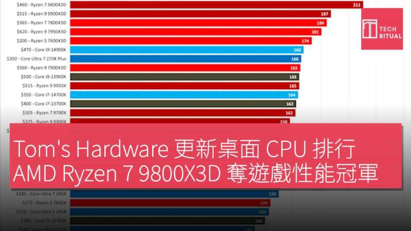 測試嚴格搭配 NVIDIA RTX 5090 FE 顯示卡,測了 17 款主流 3A 和電競遊戲,全為高、超高畫質設定,最終其遊戲幀率平均值衝到 217 FPS。同架構的 Ryzen 7 9800X3D 緊跟在後,能榨出其 97% 的性能表現。AMD Zen 5 架構的 X3D 系列處理器,直接包辦了遊戲榜前四名。3D V-Cache 大快取的優勢,在遊戲場景裡完全是降維打擊。