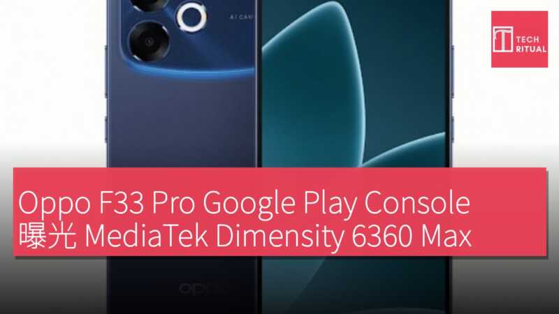 Google Play Console 列表顯示,這款手機搭載 MediaTek Dimensity 6100+ 處理器,並配備 8GB RAM。不過,Dimensity 6100+ 為 2023 年產品,疑似為記錄錯誤。螢幕解析度為 1080×2372,系統運行 Android 16。 Oppo 已官方確認 F33 Pro 配備 50MP 主鏡頭、2MP 景深鏡頭,以及 50MP 前置鏡頭,螢幕尺寸為 6.