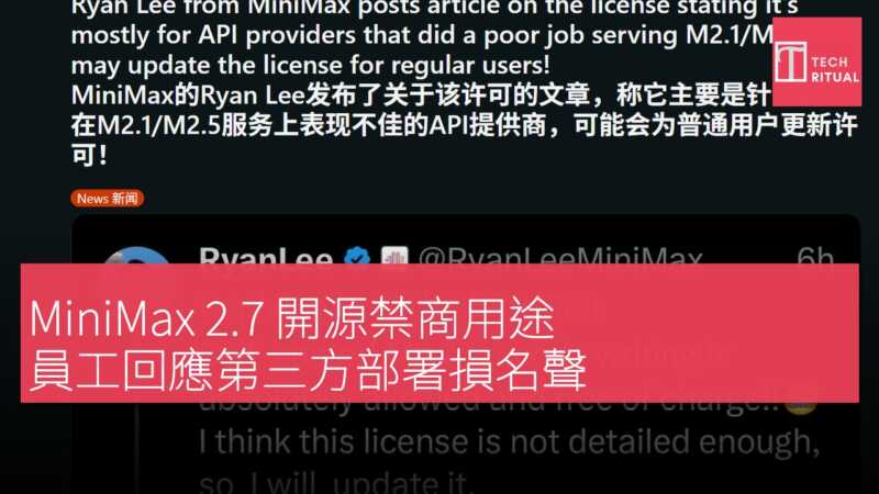 國產 AI 大模型 MiniMax 2.7 上週末正式開源,隨即現身多個平台,然而其許可證明確禁止商業用途,除非獲得授權。這一規定引發社群激烈爭議。禁止商業用途意味開發者僅能自部署娛樂使用,第三方平台部署 MiniMax 2.7 並對外提供服務即屬違規,此舉被指損害開源的最大意義,因此質疑聲浪極為強烈。 MiniMax 為何採用此類許可證?目前官方尚未回應此問題,但 MiniMax 員工 Ryan Lee 在 X 平台解釋了禁止商業用途的緣由。