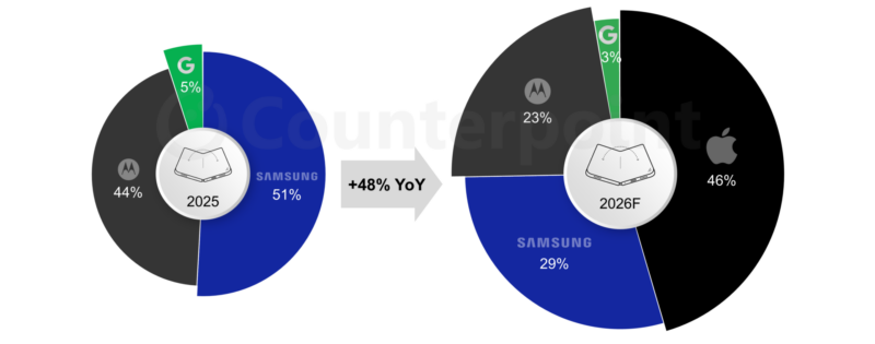| Google | 5% | 3% | | Apple | – | 46% | 報告預計,北美可摺疊手機市場整體將錄得 48% 年比年增長。即使 Apple 進場帶來變局,市場仍將擴張。有趣的是,Google 可能比 Samsung 承受更大壓力,因為 Apple 可摺疊 iPhone 的發佈時間或與 Google 下一代可摺疊機型重疊。