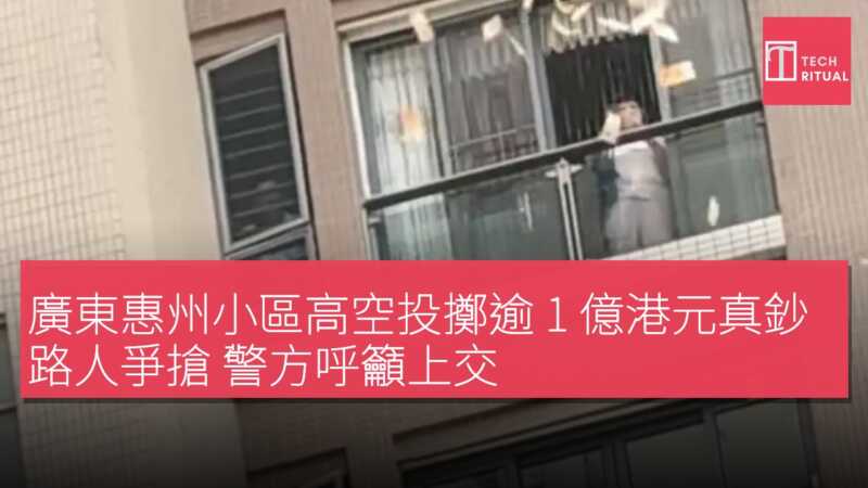 廣東 投 頭 市 一 小 區 發 生 高 空 投 擲 現 金 事 件, 大 量 港 幣 由 樓 梯 間 高 處 拋 落, 引 發 周 邊 居 民 及 路 人 瘋 狂 搶 奪。 據 瞭 解, 今 次 投 擲 的 均 為 真 鈔, 總 金 額 約 100 萬 港 元, 以 500 港 元 及 1000 港 元 面 值 為 主。